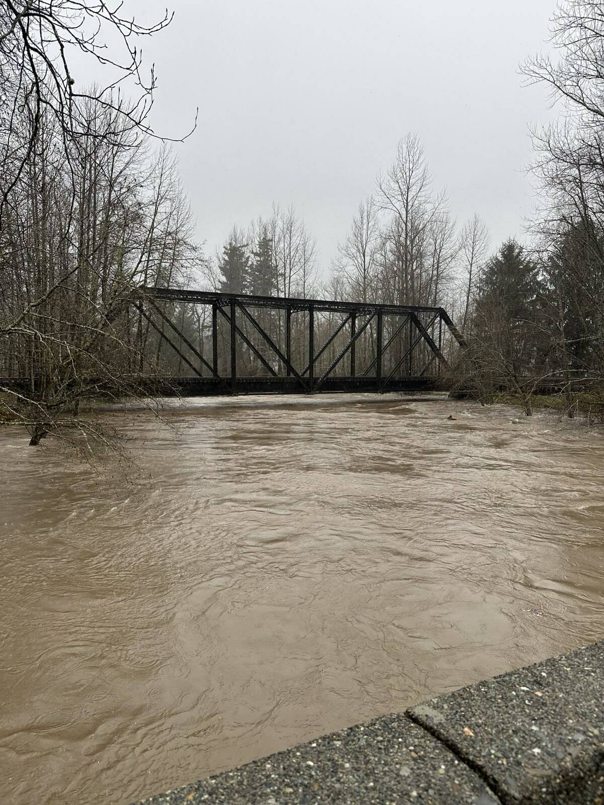 The river rises to meet a bridge during flooding in North Bend. Photo courtesy of Keegan Campbell