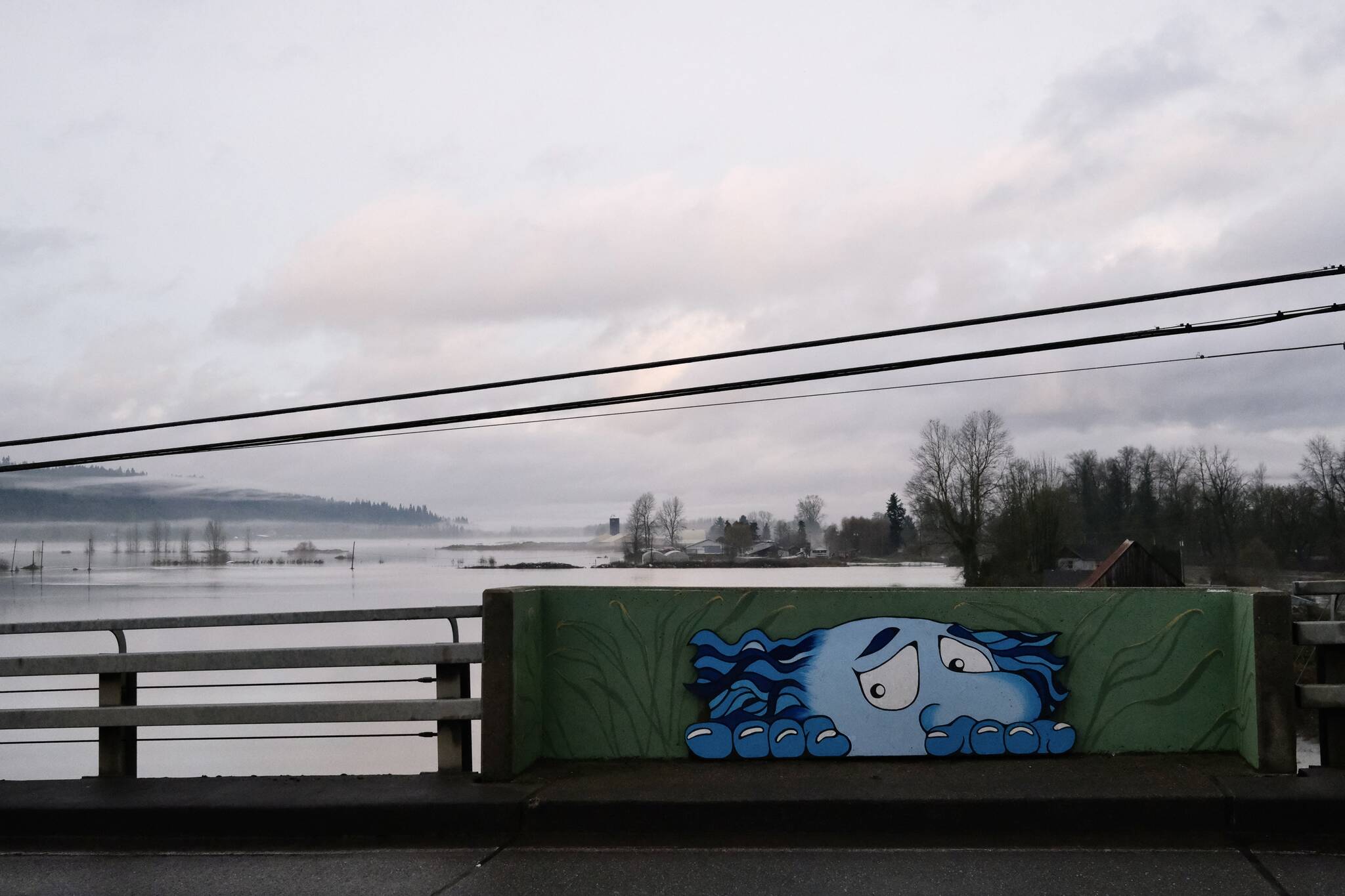 One of the Duvall bridge trolls peaks out over flooded farmlands off of NE Woodinville-Duvall Road, Dec. 12, 2025. (Grace Gorenflo/Valley Record)