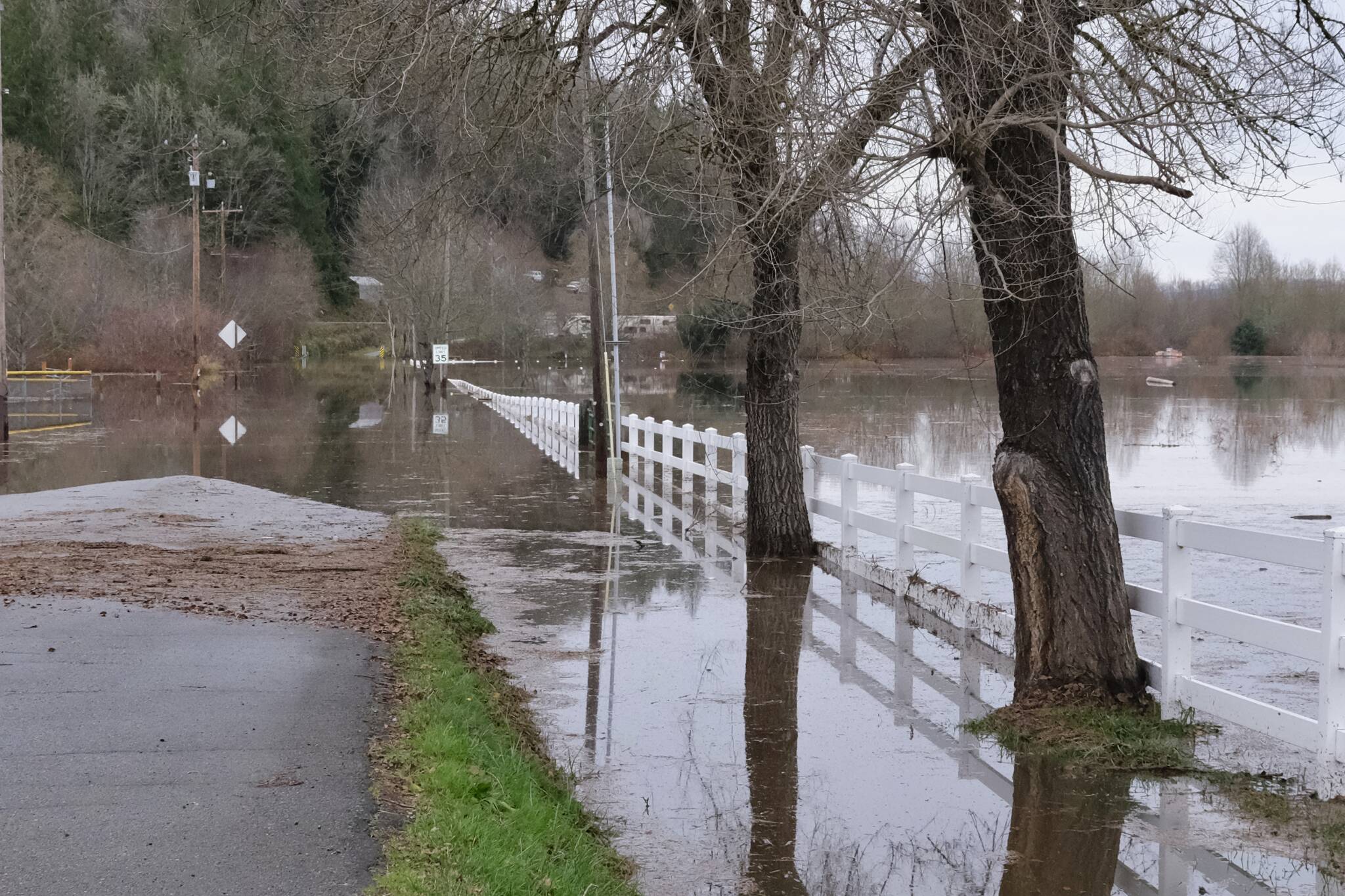 Flood waters flow over NE 124th Street at West Snoqualmie Valley Road NE outside Duvall, Dec. 9, 2025. Grace Gorenflo/Valley Record