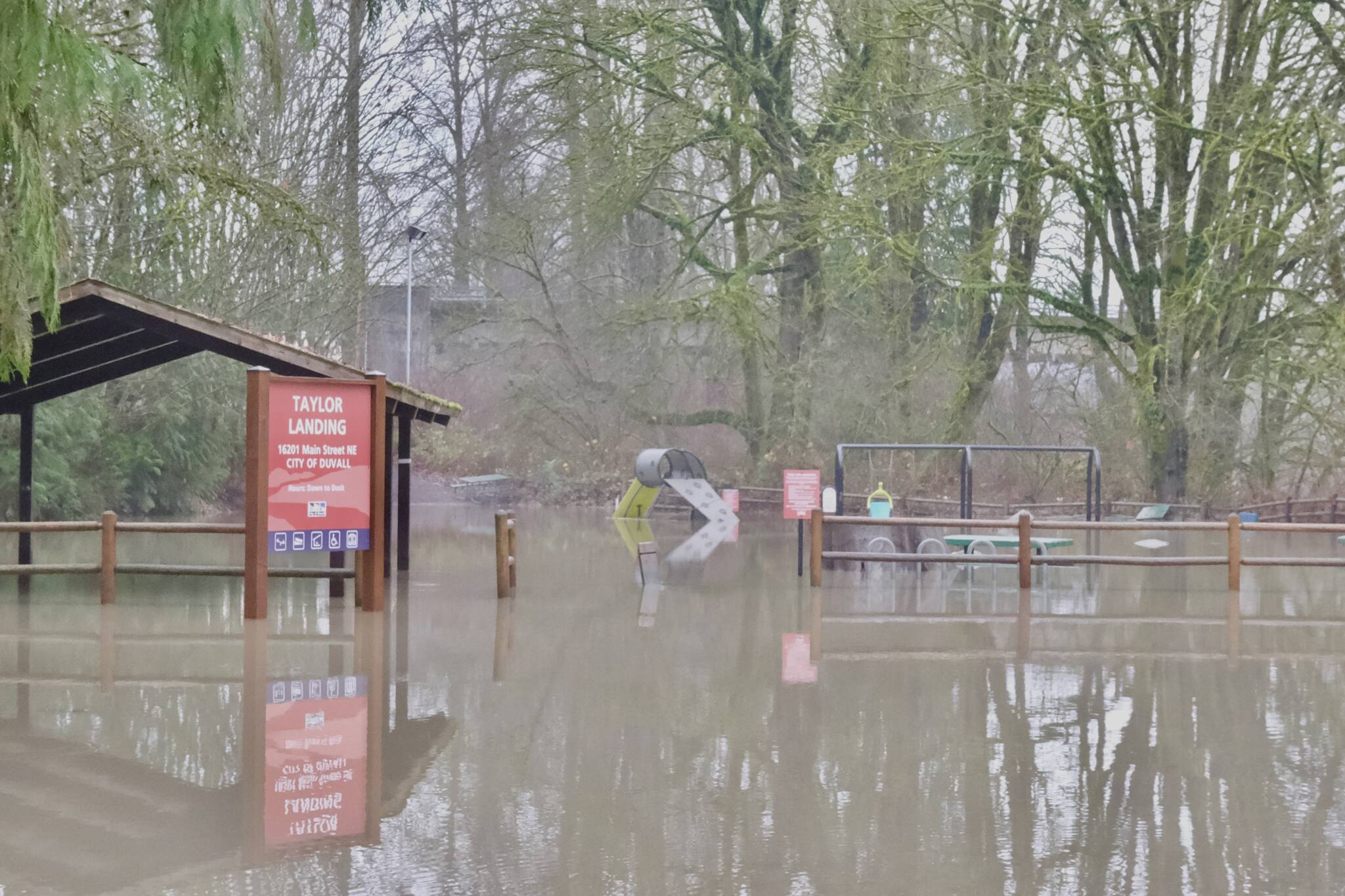 Taylor Landing, the site of the Duvall Farmers Market, is under water, Dec. 12, 2025. (Grace Gorenflo/Valley Record)
